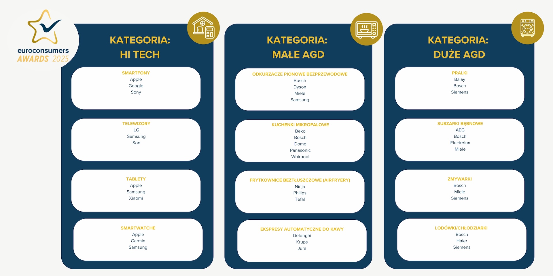 Już po raz siódmy przyznamy nagrody Euroconsumers Awards (dawniej BeXt Awards), wyróżniając marki, które mogą poszczycić się wyjątkową jakością produktów, niezawodnością i satysfakcją konsumentów. Nagrody bazują na wieloletnim doświadczeniu Euroconsumers w rygorystycznych testach laboratoryjnych, a także analizie rzeczywistych opinii i doświadczeń konsumenckich.