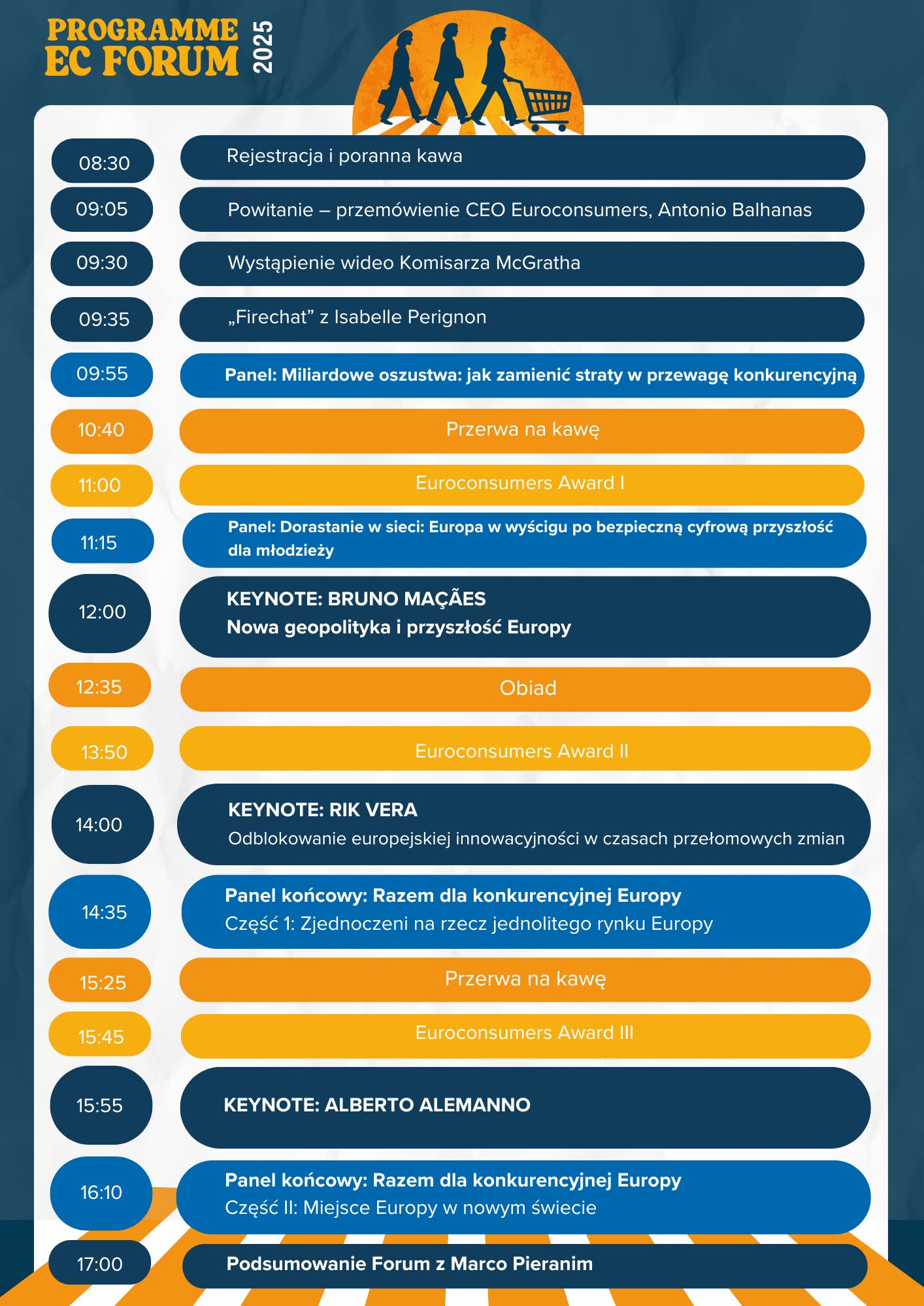 Czeka nas różnorodne grono prelegentów: od światowych autorytetów po praktyków kształtujących rzeczywistość. Porozmawiamy m.in. o młodych konsumentach w sieci, konkurencyjnym potencjale innowacyjnej żywności, walce z oszustwami oraz kierunkami dla konkurencyjnej Europy. Tradycyjnie już wręczymy także prestiżowe nagrody Euroconsumers, wyróżniając innowacyjne rozwiązania i najlepsze praktyki.